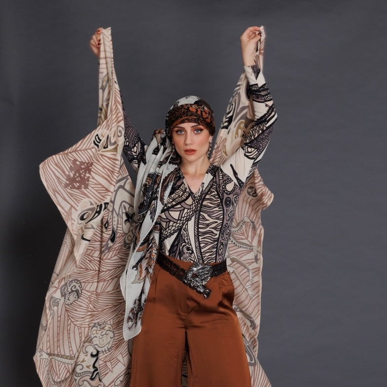 This double-sided particularly exclusive cloth is 150x150 in size and consists of two different sides in different materials and colors so that you can wear and combine it differently.
