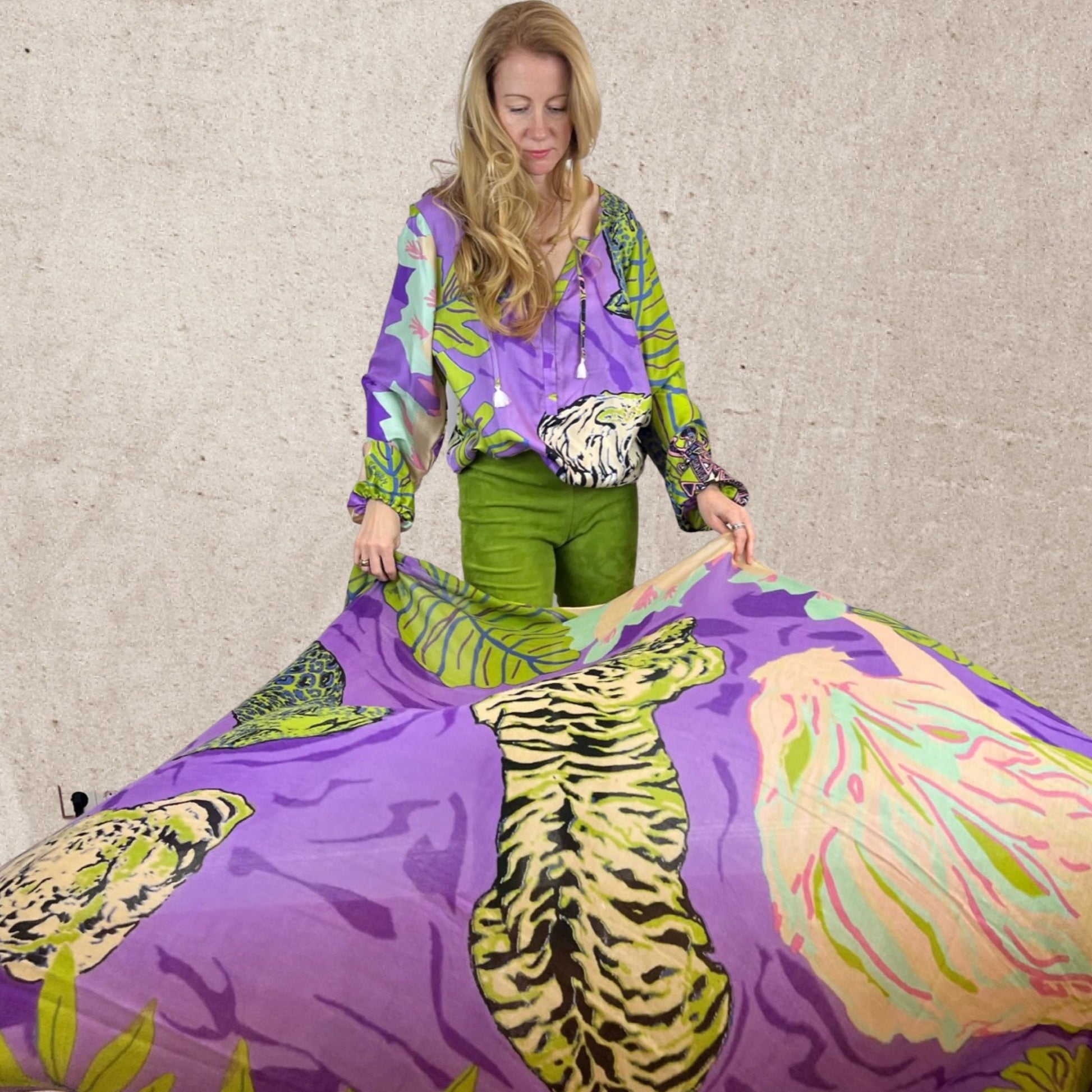 There are three color variants - this is called GREEN JUNGLE LOVE. There are so many different colors on the blouse that it is very easy to combine. Or worn as an ensemble with the matching skirt and one of our high-quality, super-lightweight cashmere scarves.