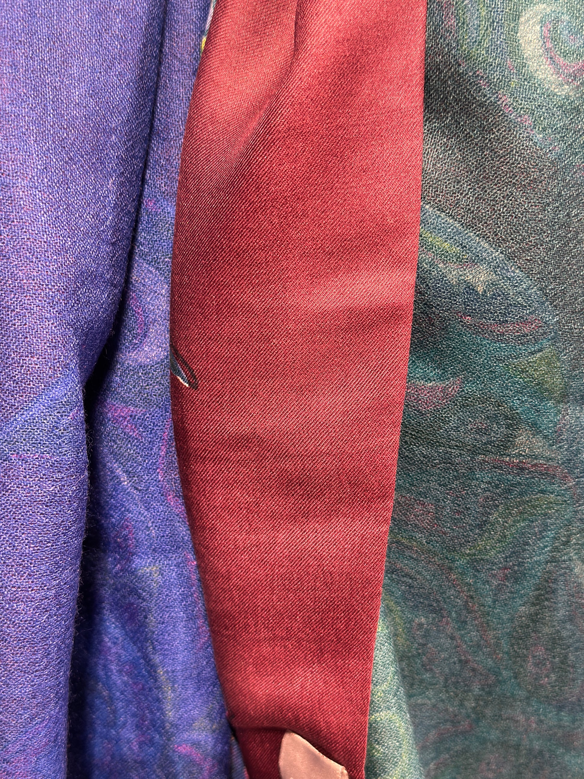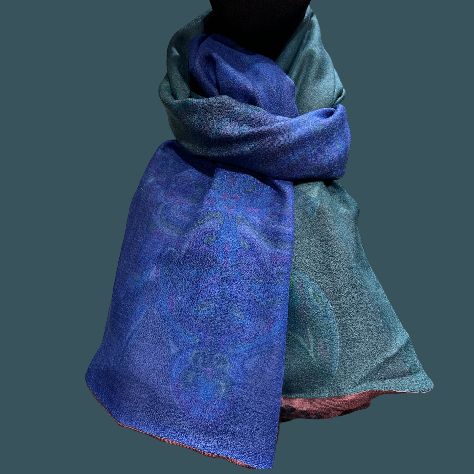 200 x 100 cm, Doubleface 100 % feinstes Changra-Baby-Kaschmir & 100 % Seide, Handmade, mit Bio-Farben bedruckt und Rückseite changierend. Limited Edition #3