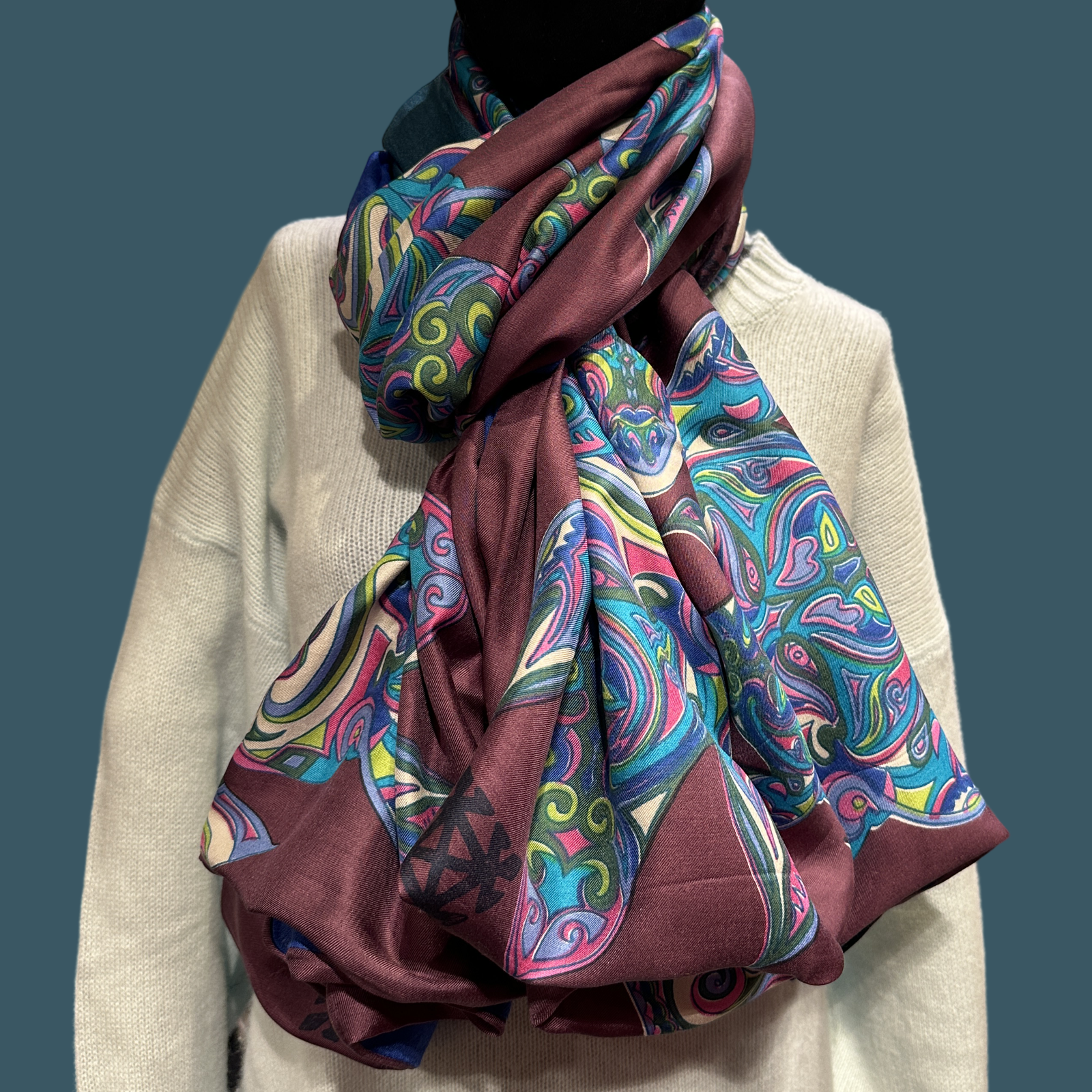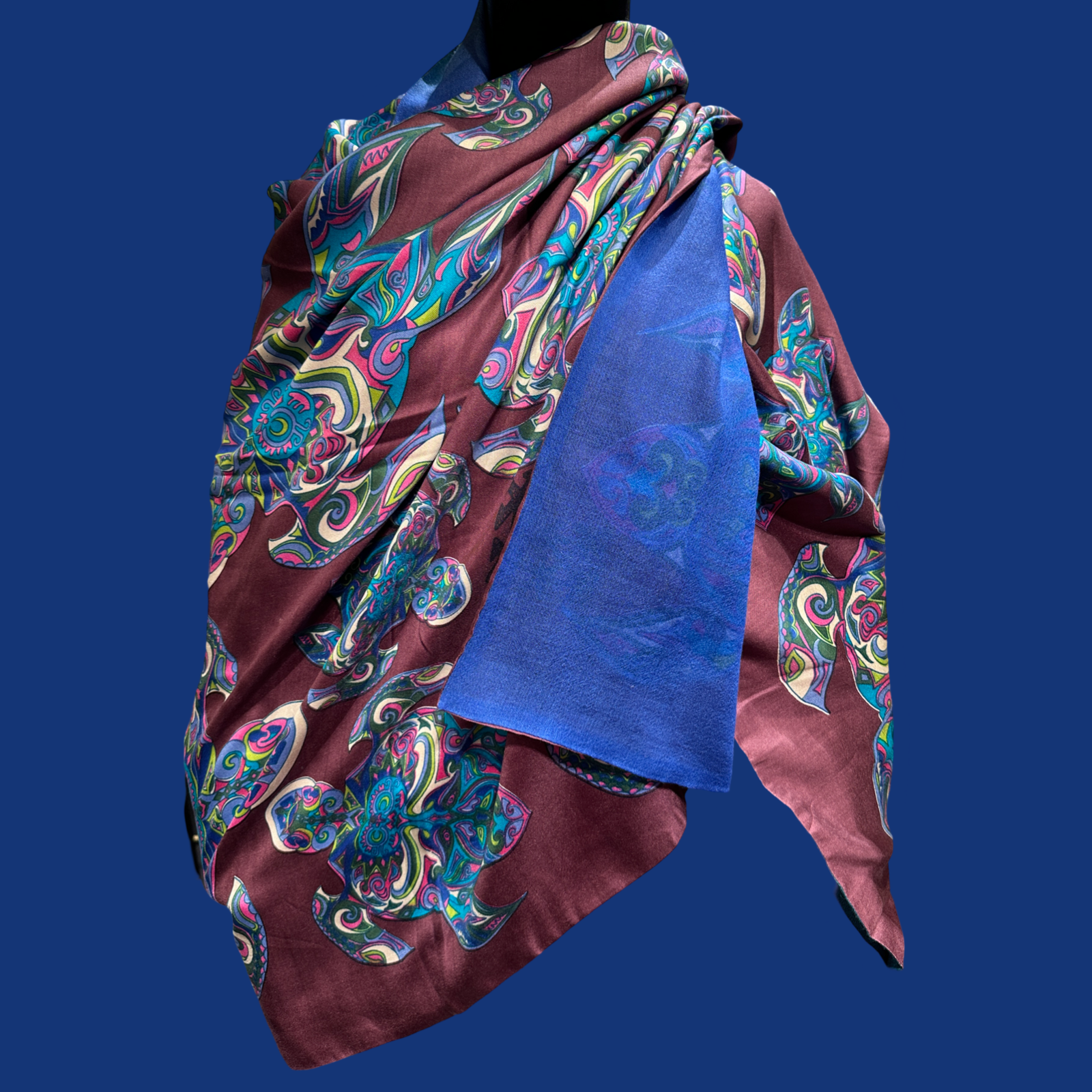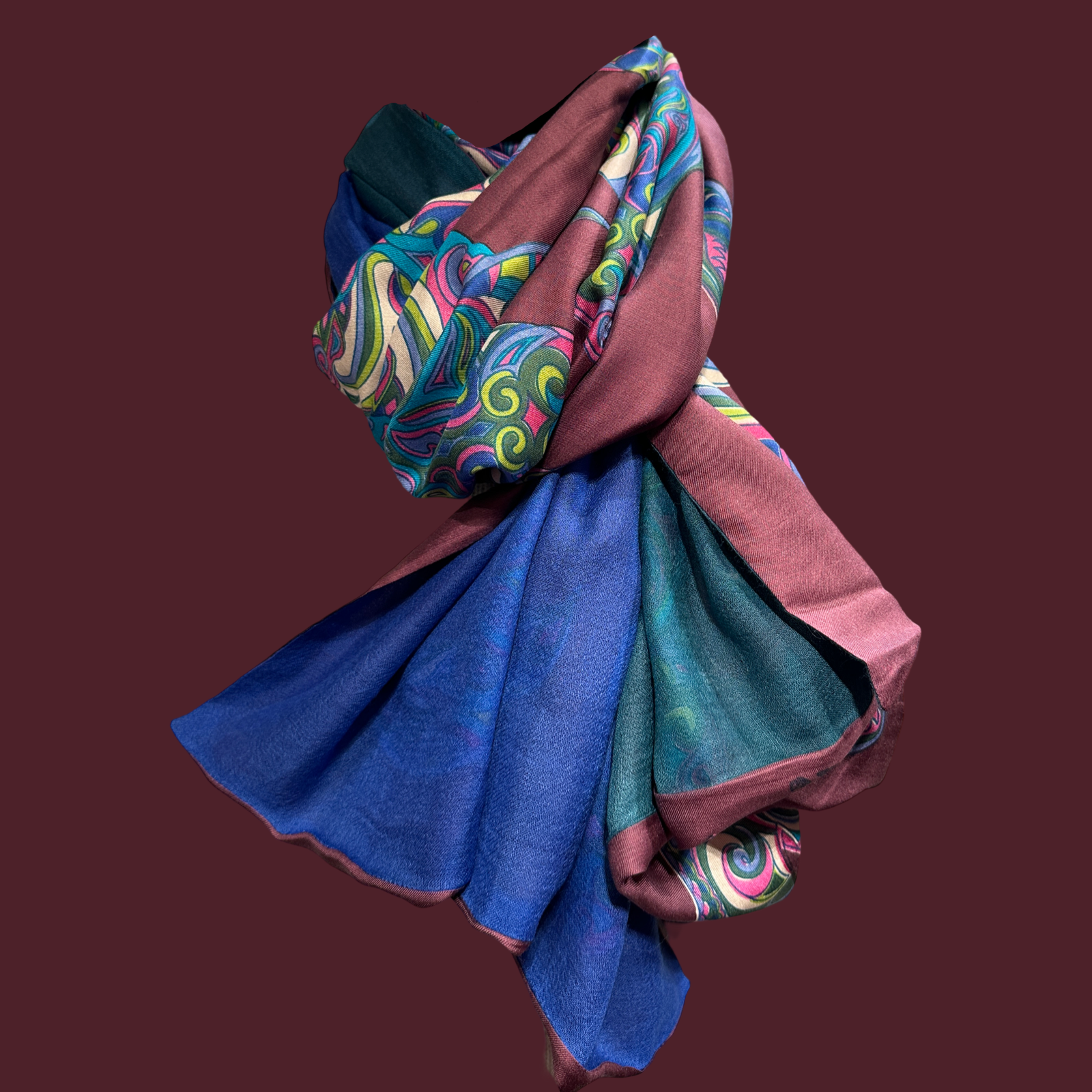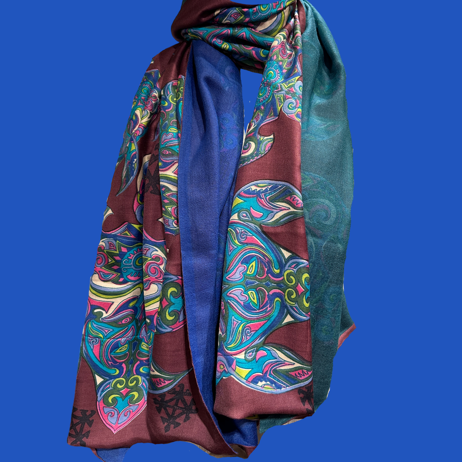 TURTLE LOVE Doubleface Kaschmir & Seiden Schal - 200x100 - Bordeaux & grűn, blau, türkis