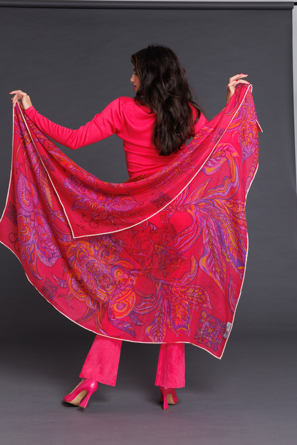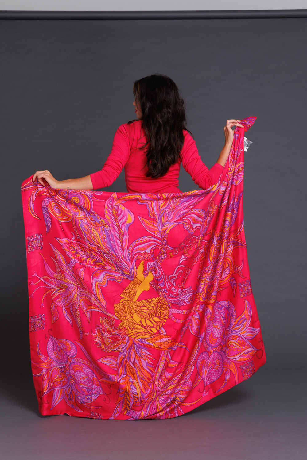 Die Farben werden aus 10 einzelnen Rahmen aufgetragen und mit aufwändigem Siebdruck verfahren bedruckt.Die limitierten Kreationen von STELLA ESVARA entstehen in liebevoller Handarbeit. Durch die Kombination von traditioneller Handwerkskunst sowie im Einklang mit einer fairen Produktion, entstehen einzigartige Kaschmir Kreationen in formvollendeter Liebe zum Detail.