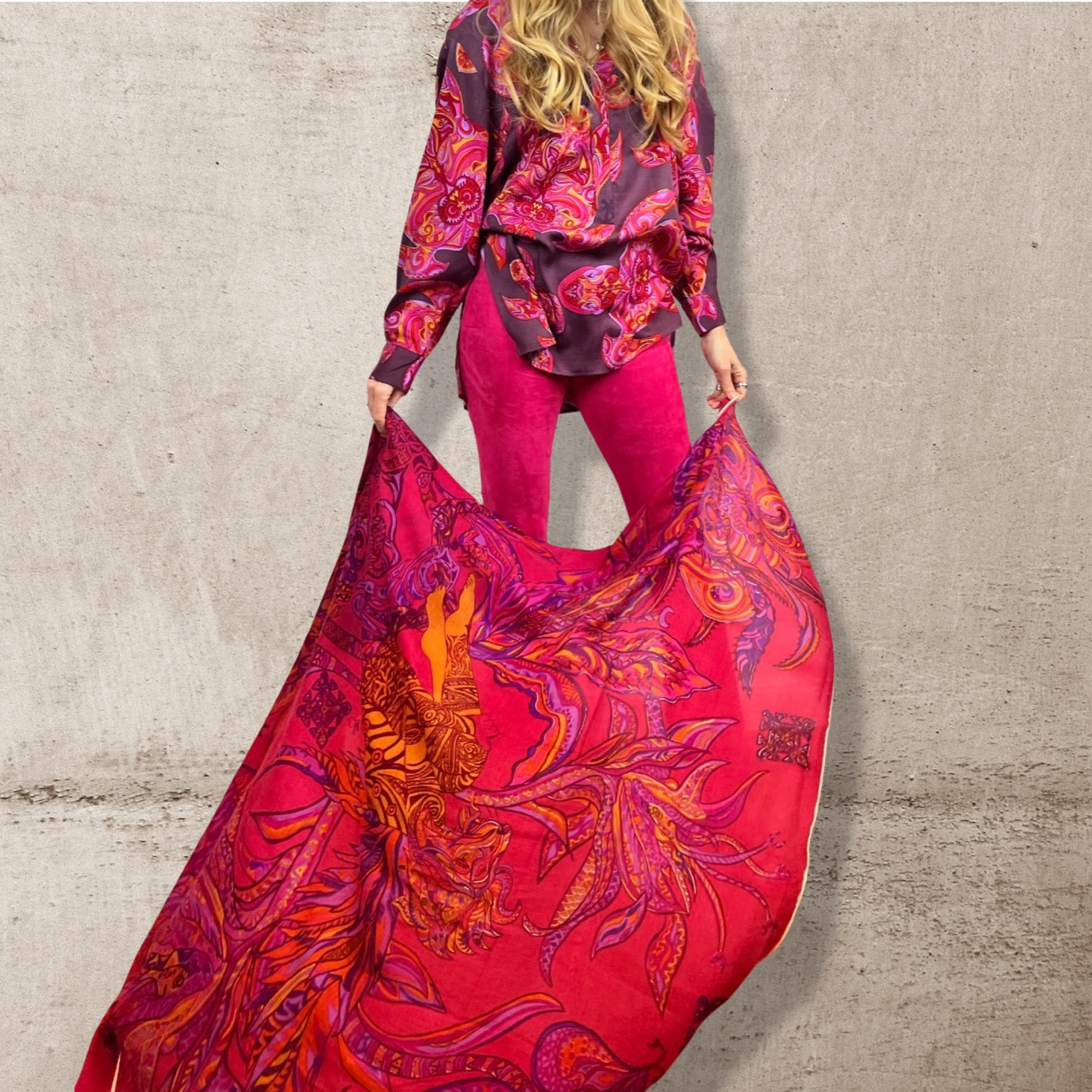 Die eine Seite ist aus handgewebten, 100% Kaschmir (aaa Qualität, diamond weave) und hat einen Farbverlauf . Die Vorderseite ist aus 100% Seide, twill weave und leuchtet durch die Seide ganz besonders farbintensiv.