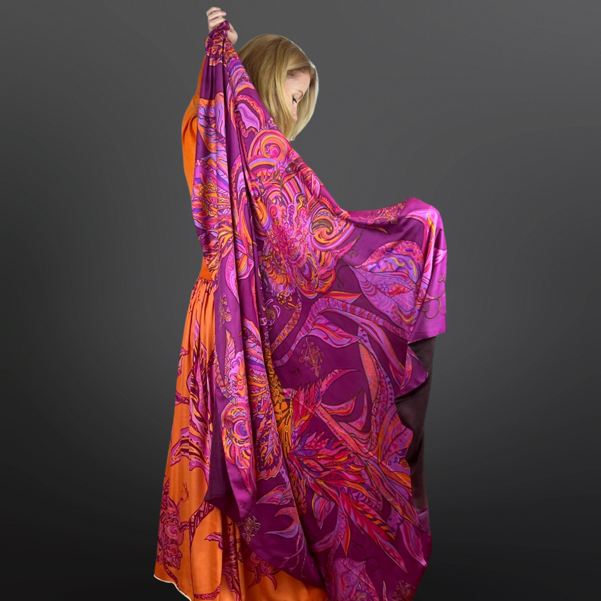 Die Vorderseite des hochwertigen, leichten Doubleface Schals besteht aus 100 % Seide. Das ausdrucksstarke Motiv, hier aus der Kollektion BONDED IN GARDEN EDEN wurde von der Künstlerin Stella Esvara per Tusche handgezeichnet, mit traditionellem Siebdruck aufgetragen und auf die handgewebte 100 % Seide gedruckt. Die Farben wurden aus 10 einzelnen Rahmen von Hand aufgetragen und bestehen aus plum, rosa und orange Schattierungen. Die Rückseite besteht aus handgewebten Kaschmir (100% AAA Qualität, diamond weave) mit dem Farbverlauf Rosa und Pflaume. Der Herstellungsprozess eines einzelnen Kaschmir-Schals bedarf über 20 Arbeitsschritte und benötigt ca. 21 Werktage.