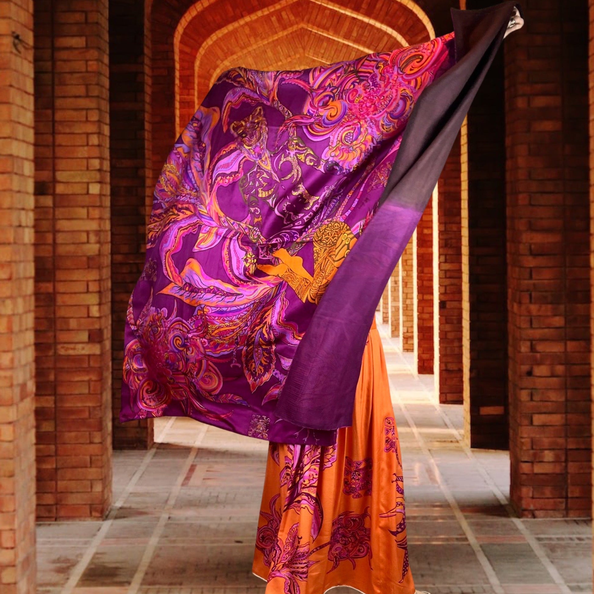“BONDED IN GARDEN EDEN” Kaschmir & Seiden-Carée-Tuch, Doubleface, Plum & blue & orange, Limitiert #3