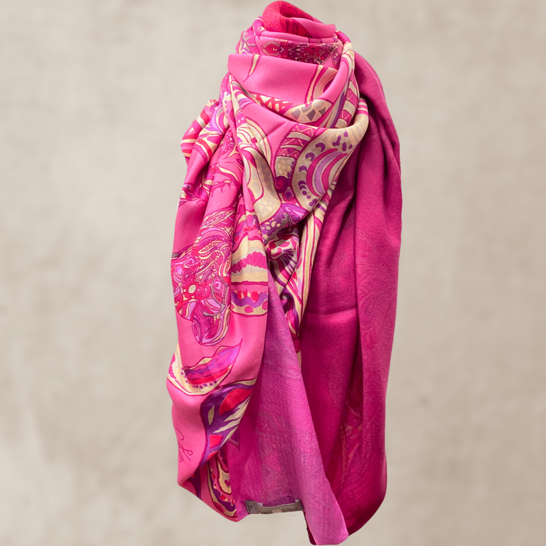 Die eine Seite ist aus handgewebten, 100% Kaschmir (aaa Qualität, diamond weave) und hat einen Farbverlauf . Die Vorderseite ist aus 100% Seide, twill weave und leuchtet durch die Seide ganz besonders farbintensiv.