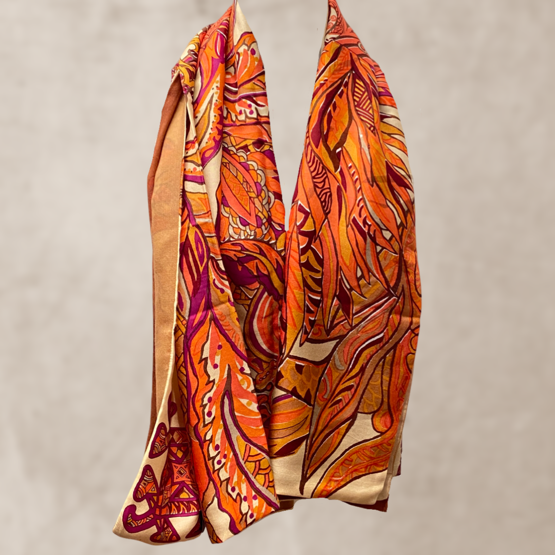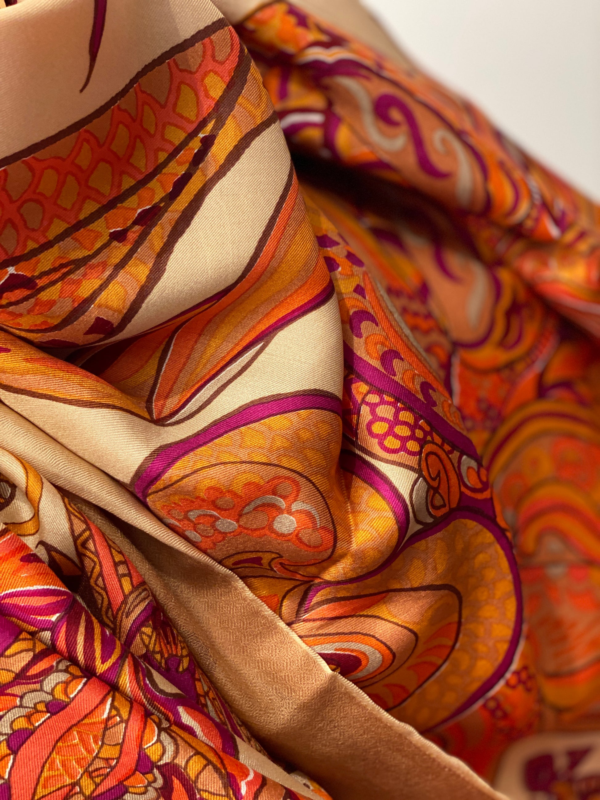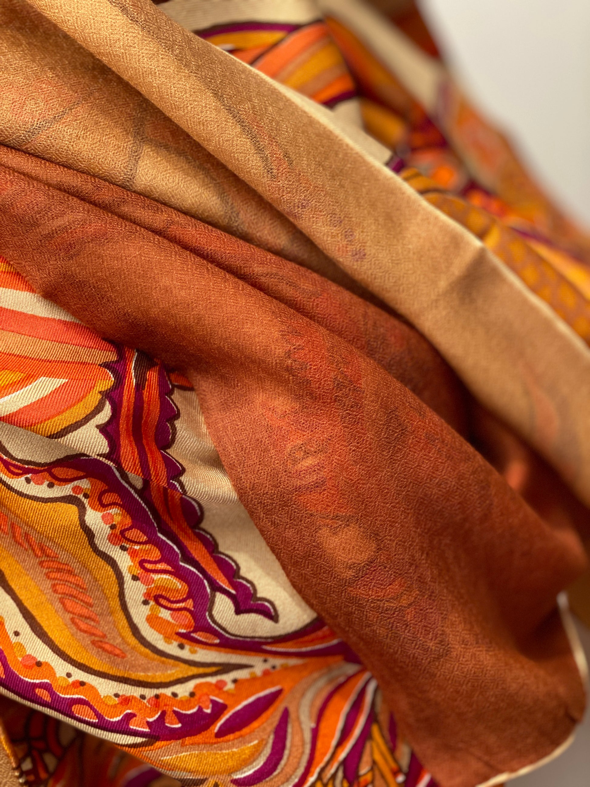 Die eine Seite ist aus handgewebten, 100% Kaschmir (aaa Qualität, diamond weave) und hat einen Farbverlauf . Die Vorderseite ist aus 100% Seide, twill weave und leuchtet durch die Seide ganz besonders farbintensiv.