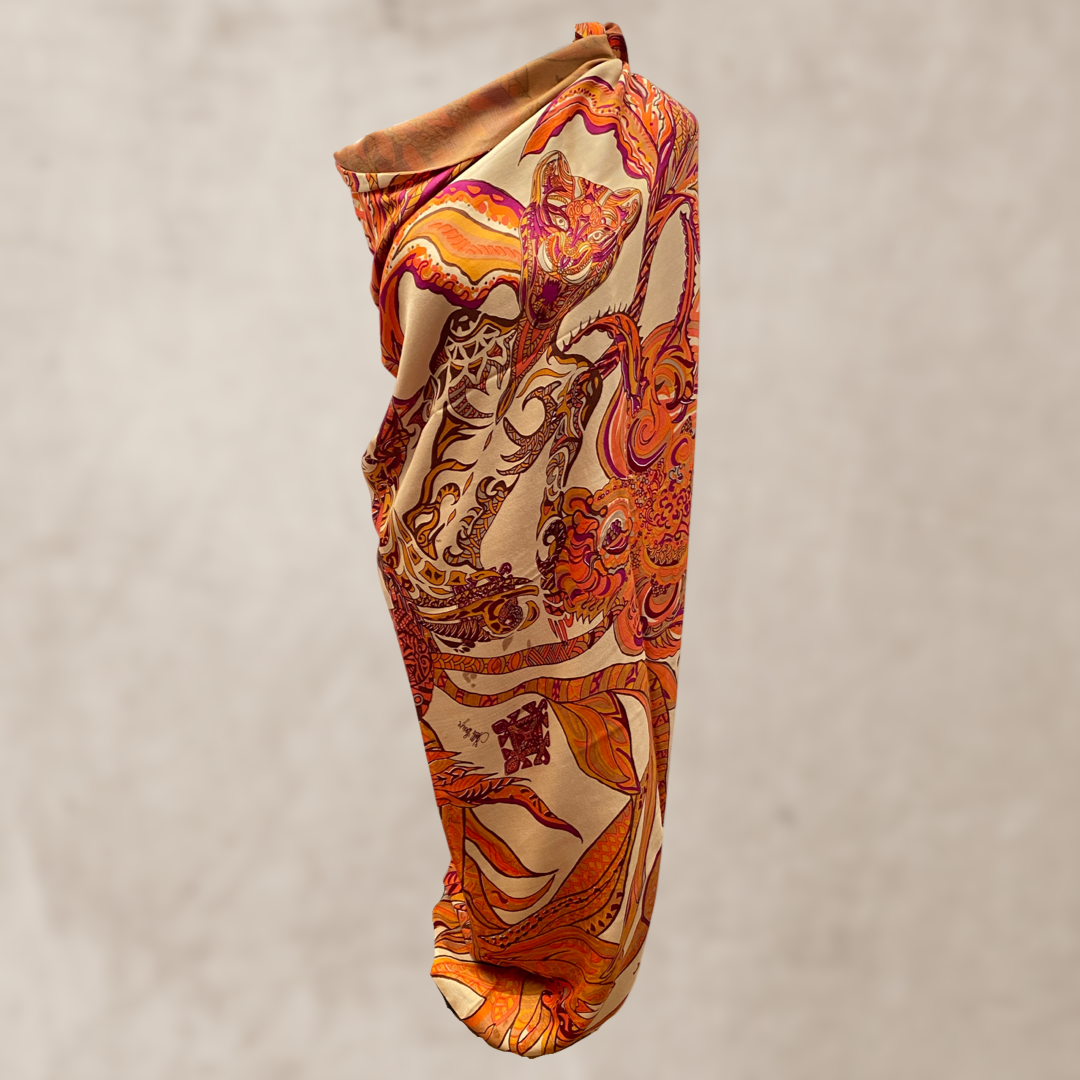 In weiteren Schritten wird mit traditionellem Siebdruck das Motiv aufgetragen und mit Bio Farben eingefärbt. Jeder Farbdruck ist aus einem unterschiedlichem Rahmen gefertigt und jede Farbe in diesem Tuch ist ein weiterer einzelner Fertigungsschritt.