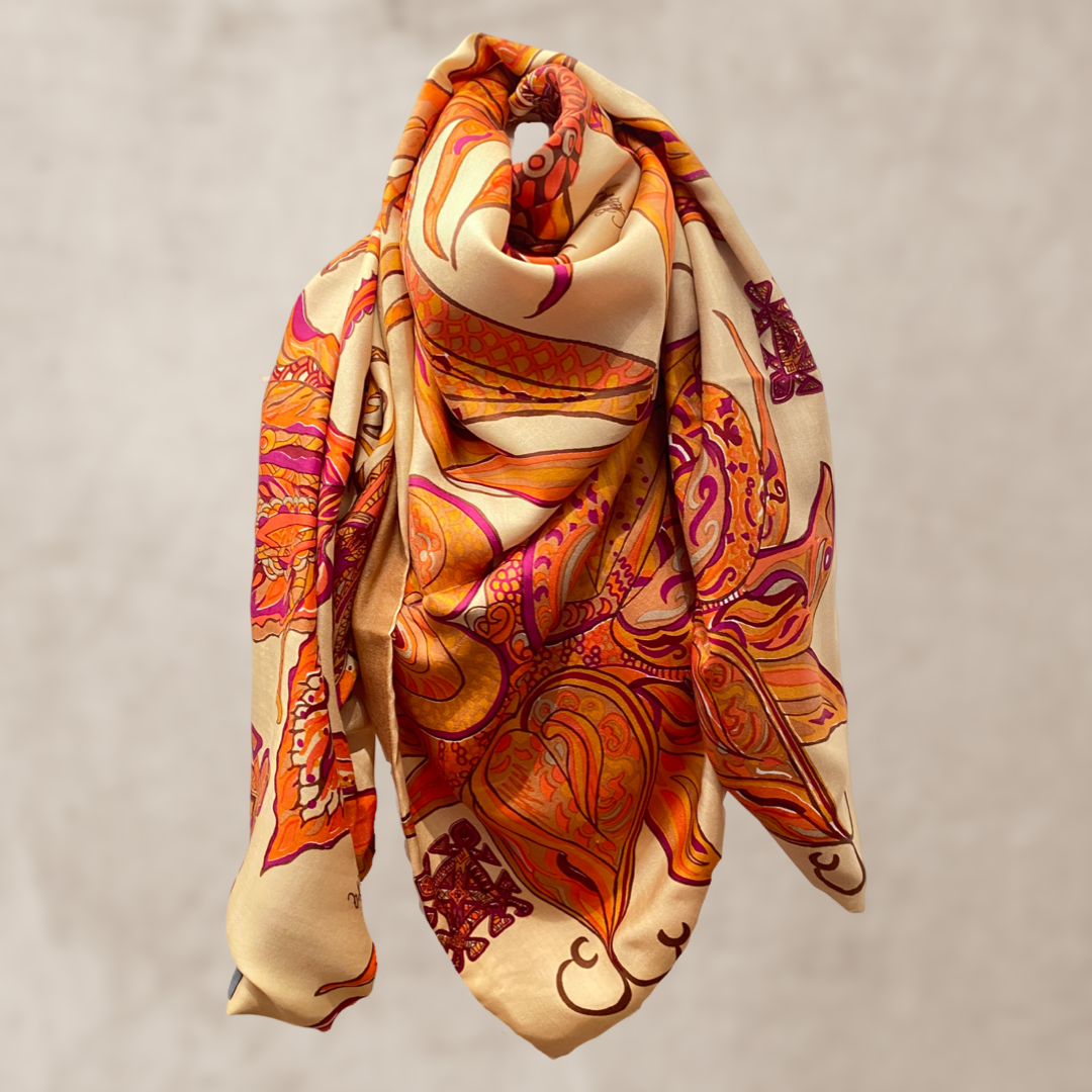 Wolle&Seide, handgewebt mit feiner Struktur, mit Allover-Print bedruckt, Hand-Siebdruck, von Hand gerollte Kanten, fair trade, mehr...