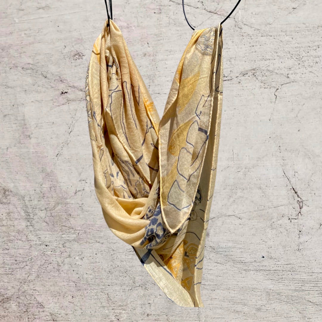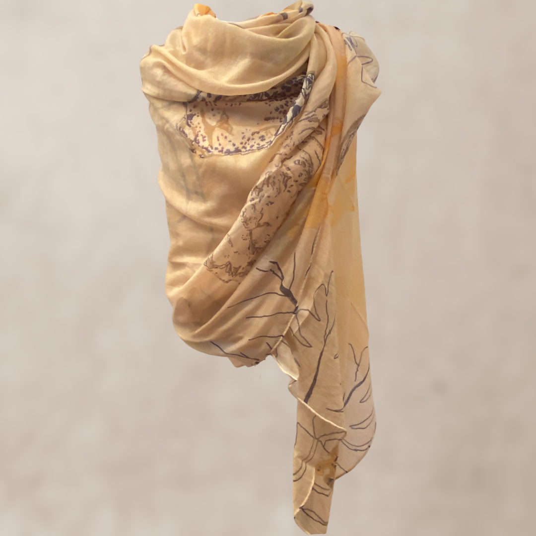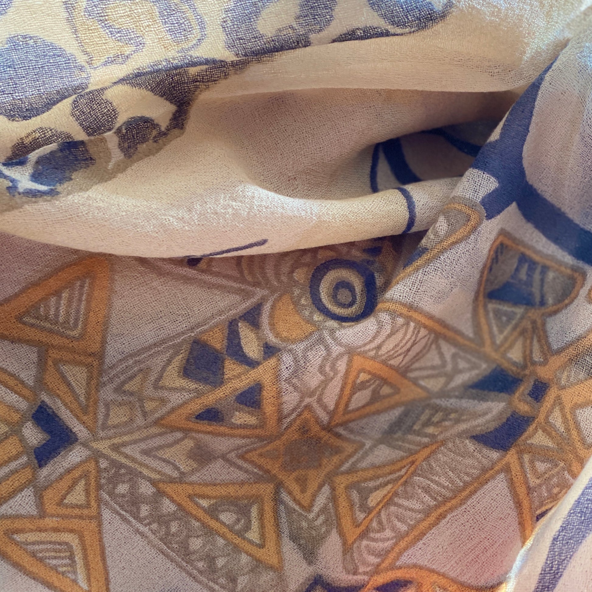 Die Künstlerin STELLA ESVARA zeichnet jedes Tuch mit Tusche (nicht am PC) und bezieht sich in den Designs auf Ihre Erinnerungen vieler Reisen, unterschiedlicher Symbolsprache und vereint diverse Kulturelle Aspekte in ein Gesamtbild.