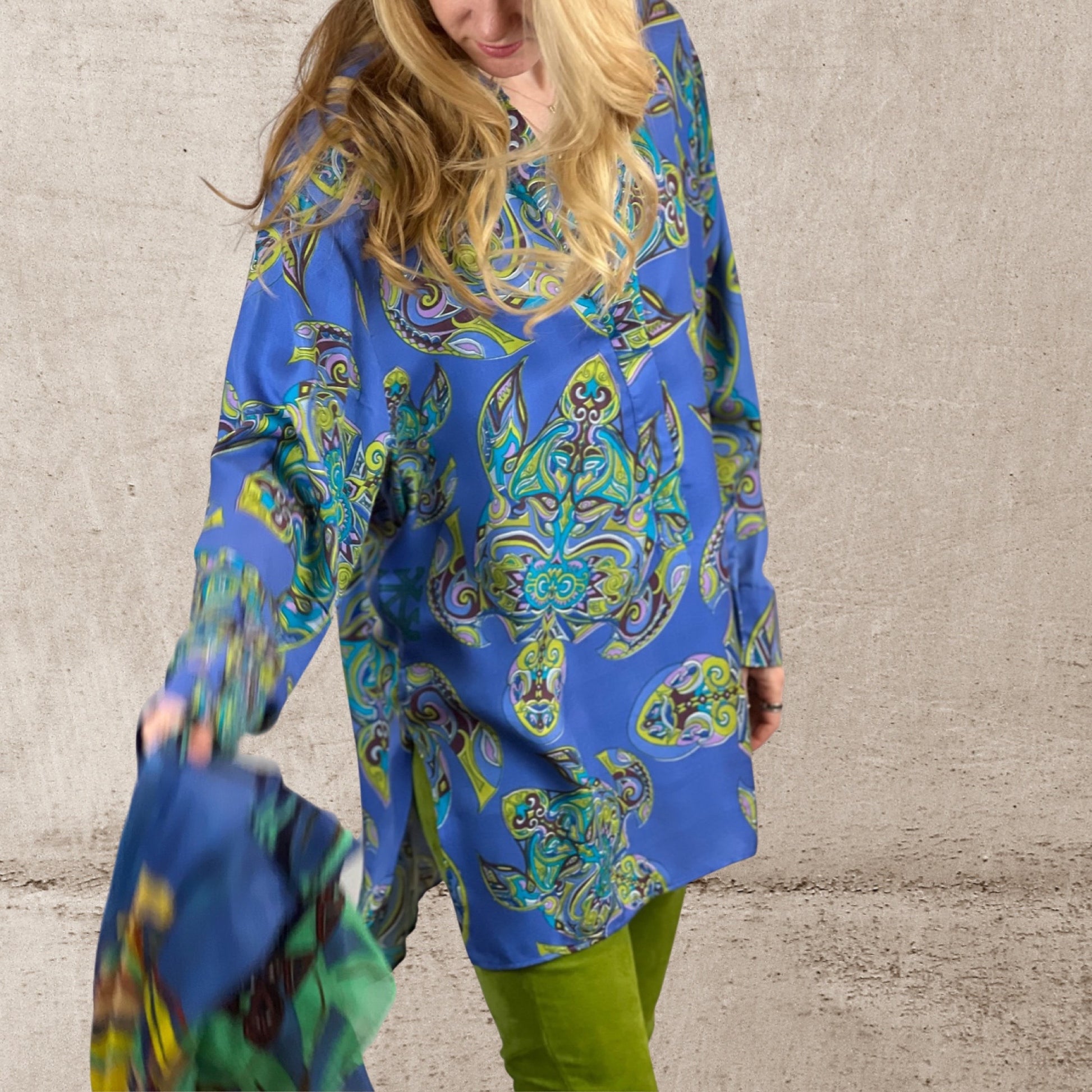 MAORI TURTLES Seidenbluse, gruen & blau, limited