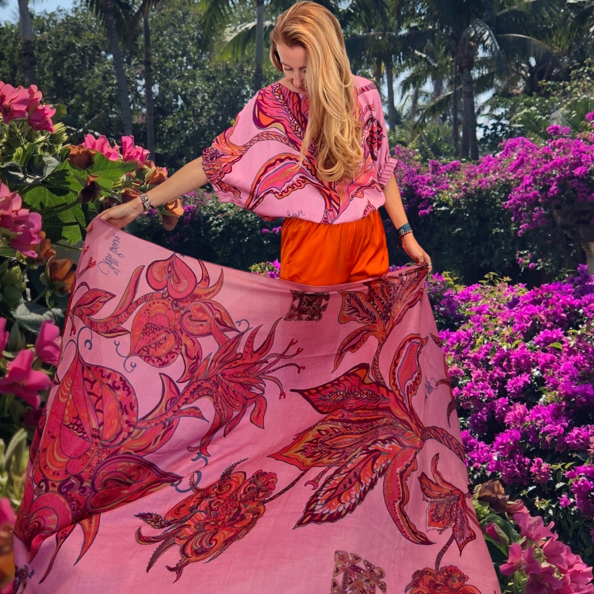SOUL FLOWERS Seidenbluse mit Fledermausärmeln, pink & orange, limited