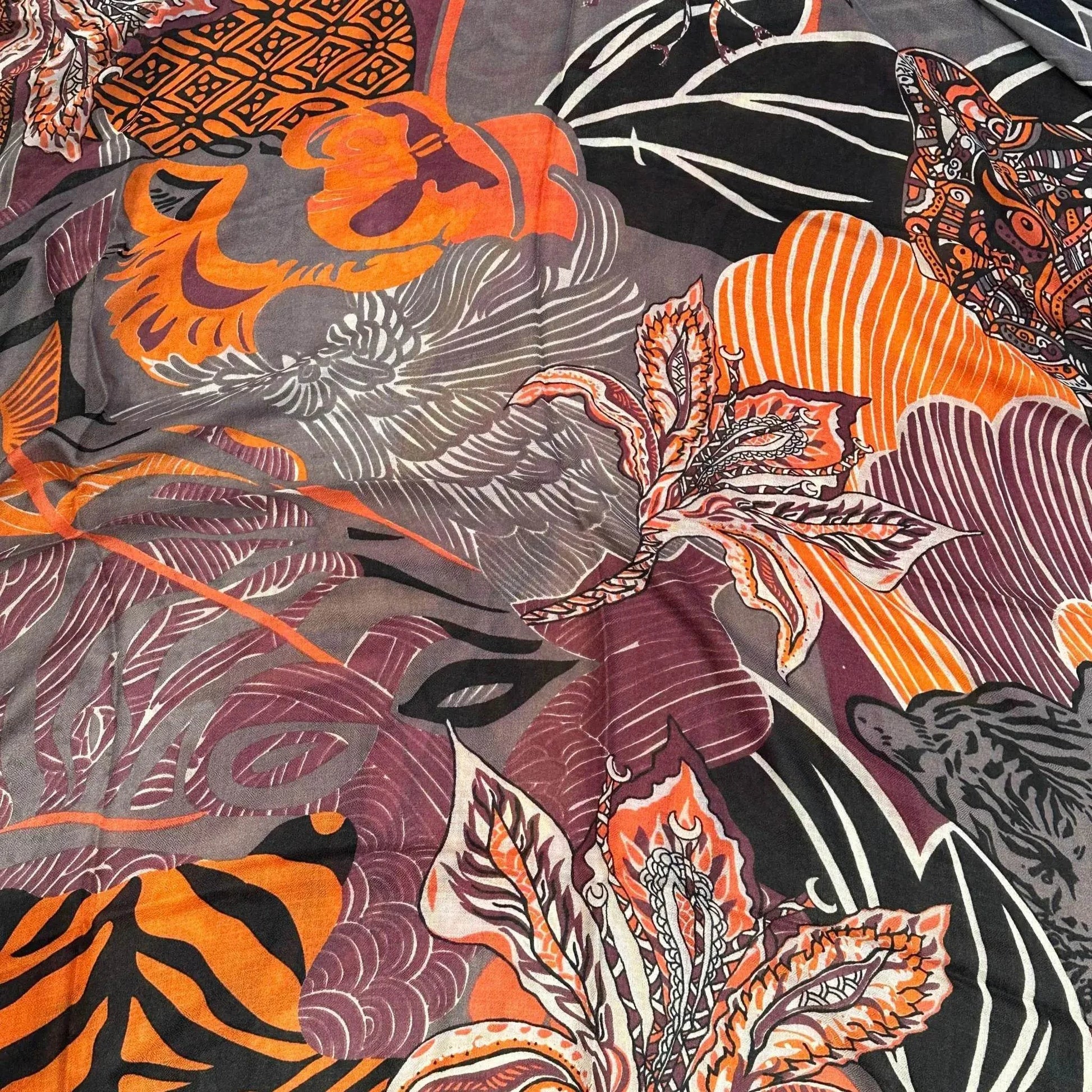 100 % allerfeinste Changra-Kaschmir-Qualität, Handgewebt - mit feiner Struktur, mit Allover-Print bedruckt, Hand-Siebdruck, Kanten von Hand gerollt, fair trade, mehr...